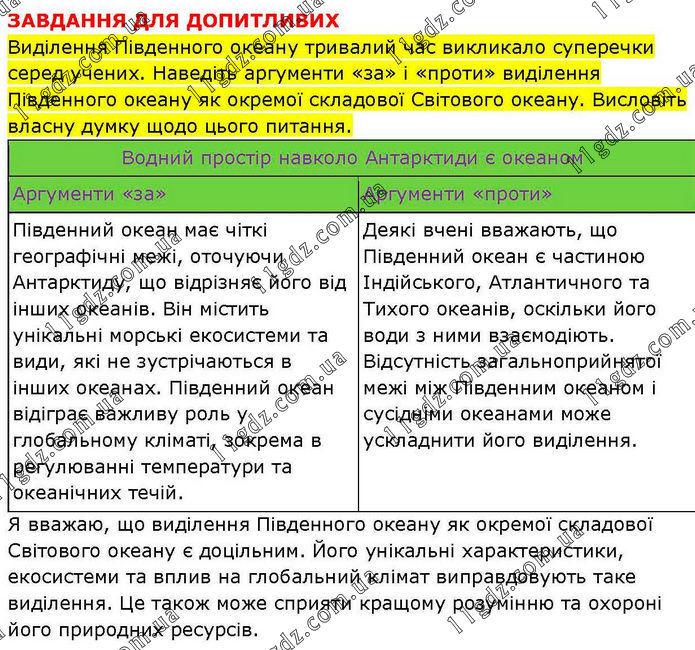 ЗАВДАННЯ ДЛЯ ДОПИТЛИВИХ Виділення Південного океану тривалий час викликало суперечки серед учених. Наведіть аргументи «за» і «проти» виділення Південного океану як окремої складової Світового океану. Висловіть власну думку щодо цього питання. Я вважаю, що виділення Південного океану як окремої складової Світового океану є доцільним. Його унікальні характеристики, екосистеми та вплив на глобальний клімат виправдовують таке виділення. Це також може сприяти кращому розумінню та охороні його природних ресурсів.