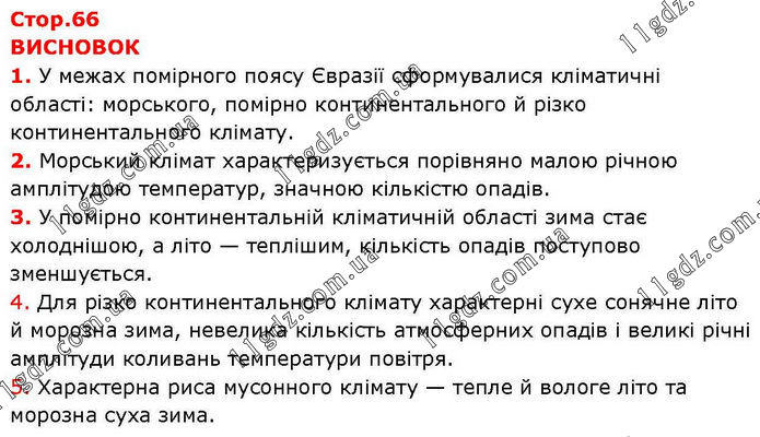 ВИСНОВОК 1. У межах помірного поясу Євразії сформувалися кліматичні області: морського, помірно континентального й різко континентального клімату. 2. Морський клімат характеризується порівняно малою річною амплітудою температур, значною кількістю опадів. 3. У помірно континентальній кліматичній області зима стає холоднішою, а літо — теплішим, кількість опадів поступово зменшується. 4. Для різко континентального клімату характерні сухе сонячне літо й морозна зима, невелика кількість атмосферних опадів і великі річні амплітуди коливань температури повітря. 5. Характерна риса мусонного клімату — тепле й вологе літо та морозна суха зима.