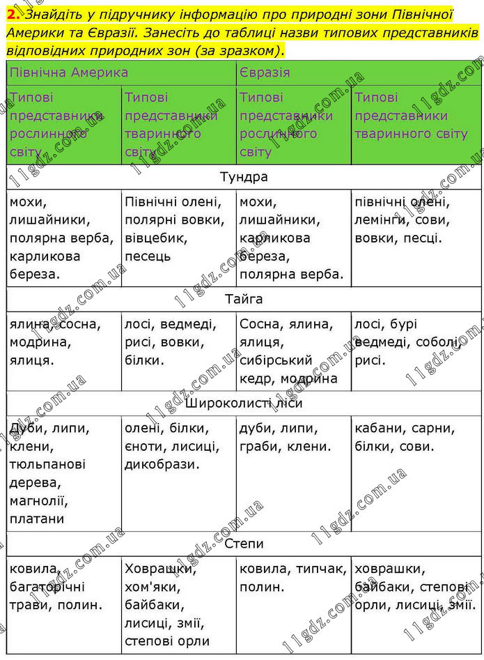Знайдіть у підручнику інформацію про природні зони Північної Америки та Євразії. Занесіть до таблиці назви типових представників відповідних природних зон (за зразком).