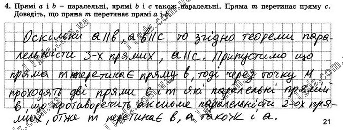 Прямі а і b — паралельні, прямі b і с також паралельні. Пряма т перетинає пряму с. Доведіть, що пряма т перетинає прямі а і b.