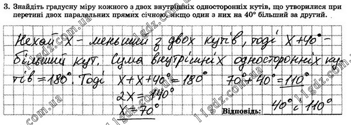 Знайдіть градусну міру кожного з двох внутрішніх односторонніх кутів, що утворилися при перетині двох паралельних прямих січною, якщо один з них на 40° більший за другий.