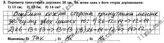 +Периметр трикутника дорівнює 26 см. Чи може одна з його сторін дорівнювати: 1) 12 см; 2) 13 см; 3) 14 см?