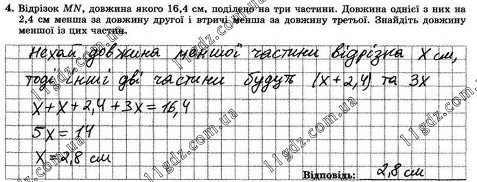 Відрізок МN, довжина якого 16,4 см, поділено на три частини. Довжина однієї з них на 2,4 см менша за довжину другої і втричі менша за довжину третьої. Знайдіть довжину меншої із цих частин.