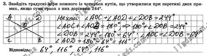 Знайдіть градусні міри кожного із чотирьох кутів, що утворилися при перетині двох прямих, якщо сума трьох з них дорівнює 244°.