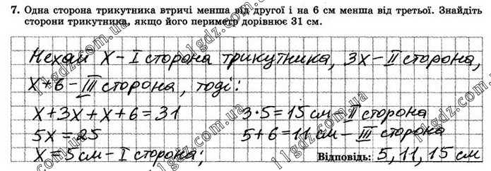 Одна сторона трикутника втричі менша від другої і на 6 см менша від третьої. Знайдіть сторони трикутника, якщо його периметр дорівнює 31 см.