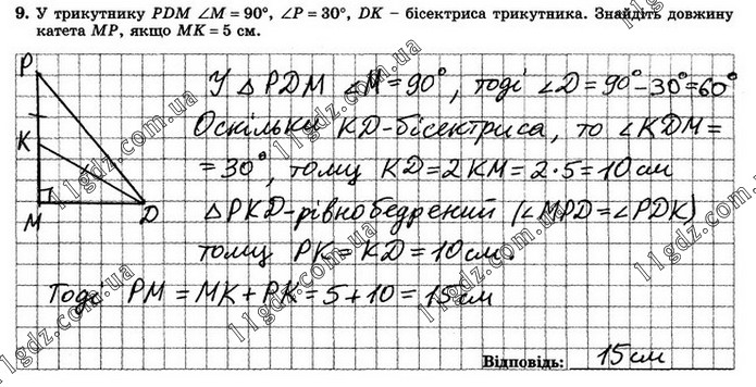 У трикутнику РDМ M = 90°, Р = 30°, DK - бісектриса трикутника. Знайдіть довжину катета МР, якщо МК = 5 см.