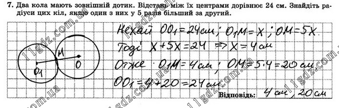 Два кола мають зовнішній дотик. Відстань між їх центрами дорівнює 24 см. Знайдіть радіуси цих кіл, якщо один з них у 5 разів більший за другий.