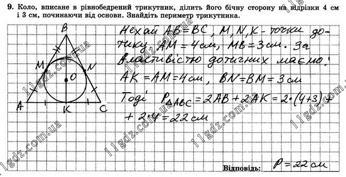 Коло, вписане в рівнобедрений трикутник, ділить його бічну сторону на відрізки 4 см і 3 см, починаючи від основи. Знайдіть периметр трикутника.