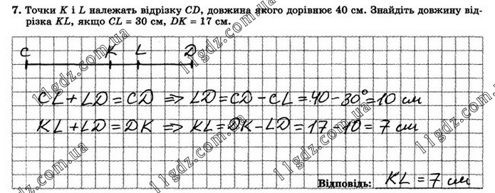Точки К і L належать відрізку СD, довжина якого дорівнює 40 см. Знайдіть довжину відрізка КL, якщо СL = З0 см, DК = 17 см.