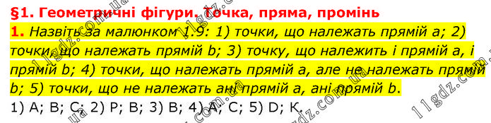 §1. Геометричні фігури. Точка, пряма, промінь 1. Назвіть за малюнком 1.9: 1) точки, що належать прямій а; 2) точки, що належать прямій b; 3) точку, що належить і прямій а, і прямій b; 4) точки, що належать прямій а, але не належать прямій b; 5) точки, що не належать ані прямій а, ані прямій b. 1) А; В; С; 2) Р; В; 3) В; 4) А; С; 5) D; К.