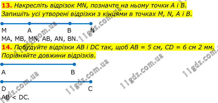 Накресліть відрізок MN, позначте на ньому точки А і В. Запишіть усі утворені відрізки з кінцями в точках М, N, A і В. MA, MB, MN, AB, AN, BN. 14. Побудуйте відрізки AB і DC так, щоб AB = 5 см, CD = 6 см 2 мм. Порівняйте довжини відрізків. AB < DC.