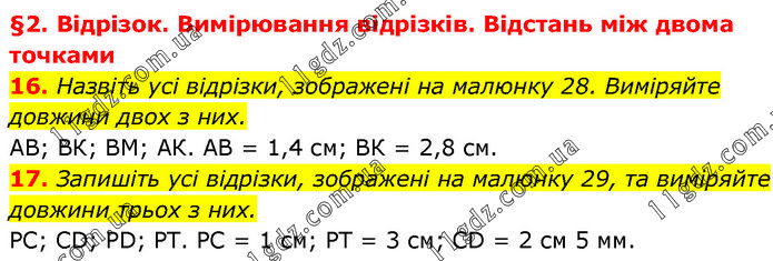 §2. Відрізок. Вимірювання відрізків. Відстань між двома точками 16. Назвіть усі відрізки, зображені на малюнку 28. Виміряйте довжини двох з них. АВ; ВК; ВМ; АК. АВ = 1,4 см; ВК = 2,8 см. 17. Запишіть усі відрізки, зображені на малюнку 29, та виміряйте довжини трьох з них. РС; CD; PD; PT. PC = 1 см; РТ = 3 см; CD = 2 см 5 мм.