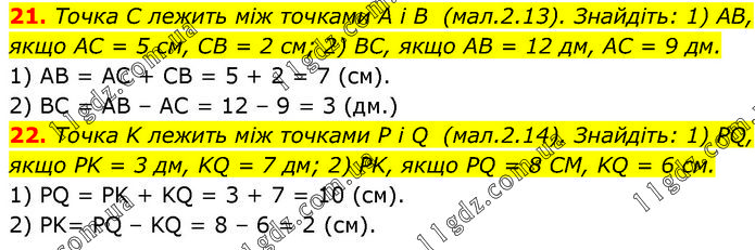 21. Точка C лежить між точками А і В (мал.2.13). Знайдіть: 1) AB, якщо AC = 5 см, CB = 2 см; 2) BC, якщо AB = 12 дм, AC = 9 дм. 1) АВ = АС + СВ = 5 + 2 = 7 (см). 2) ВС = АВ – АС = 12 – 9 = 3 (дм.) 22. Точка K лежить між точками P і Q (мал.2.14). Знайдіть: 1) PQ, якщо PK = 3 дм, KQ = 7 дм; 2) PK, якщо PQ = 8 CM, KQ = 6 см. 1) PQ = PK + KQ = 3 + 7 = 10 (см). 2) PK= PQ – KQ = 8 – 6 = 2 (см).