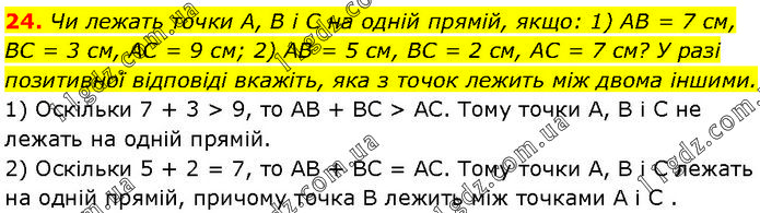 Чи лежать точки А, В і C на одній прямій, якщо: 1) AB = 7 см, BC = 3 см, AC = 9 см; 2) AB = 5 см, BC = 2 см, AC = 7 см? У разі позитивної відповіді вкажіть, яка з точок лежить між двома іншими. 1) Оскільки 7 + 3 > 9, то AB + BC > АС. Тому точки А, В і C не лежать на одній прямій. 2) Оскільки 5 + 2 = 7, то AB + BC = АС. Тому точки А, В і C лежать на одній прямій, причому точка В лежить між точками A і C .