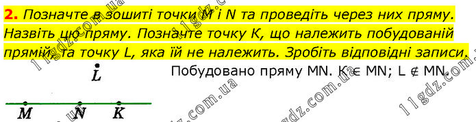 Позначте в зошиті точки М і N та проведіть через них пряму. Назвіть цю пряму. Позначте точку К, що належить побудованій прямій, та точку L, яка їй не належить. Зробіть відповідні записи. Побудовано пряму MN. К ∈ MN; L ∉ MN.