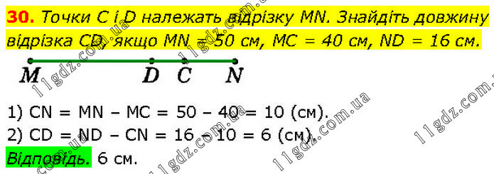 Точки C і D належать відрізку MN. Знайдіть довжину відрізка CD, якщо MN = 50 см, MC = 40 см, ND = 16 см. 1) CN = MN – MC = 50 – 40 = 10 (см). 2) CD = ND – CN = 16 – 10 = 6 (см). Відповідь. 6 см.