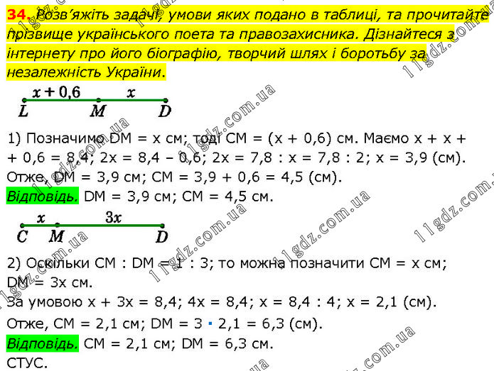 Розв’яжіть задачі, умови яких подано в таблиці, та прочитайте прізвище українського поета та правозахисника. Дізнайтеся з інтернету про його біографію, творчий шлях і боротьбу за незалежність України. 1) Позначимо DM = x см; тоді CM = (x + 0,6) см. Маємо x + x + + 0,6 = 8,4; 2x = 8,4 – 0,6; 2x = 7,8 : x = 7,8 : 2; x = 3,9 (см). Отже, DM = 3,9 см; CM = 3,9 + 0,6 = 4,5 (см). Відповідь. DM = 3,9 см; CM = 4,5 см. 2) Оскільки CM : DM = 1 : 3; то можна позначити CM = x см; DM = 3x см. За умовою x + 3x = 8,4; 4x = 8,4; x = 8,4 : 4; x = 2,1 (см). Отже, CM = 2,1 см; DM = 3 ∙ 2,1 = 6,3 (см). Відповідь. CM = 2,1 см; DM = 6,3 см. СТУС.