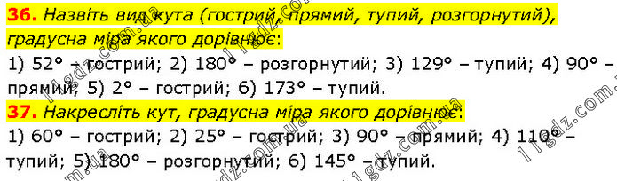 36. Назвіть вид кута (гострий, прямий, тупий, розгорнутий), градусна міра якого дорівнює: 1) 52° – гострий; 2) 180° – розгорнутий; 3) 129° – тупий; 4) 90° – прямий; 5) 2° – гострий; 6) 173° – тупий. 37. Накресліть кут, градусна міра якого дорівнює: 1) 60° – гострий; 2) 25° – гострий; 3) 90° – прямий; 4) 110° – тупий; 5) 180° – розгорнутий; 6) 145° – тупий.