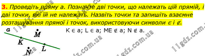 Проведіть пряму а. Позначте дві точки, що належать цій прямій, і дві точки, які їй не належать. Назвіть точки та запишіть взаємне розташування прямої і точок, використовуючи символи ∈ і ∉. К ∈ а; L ∈ а; МЕ ∉ а; N ∉ а.