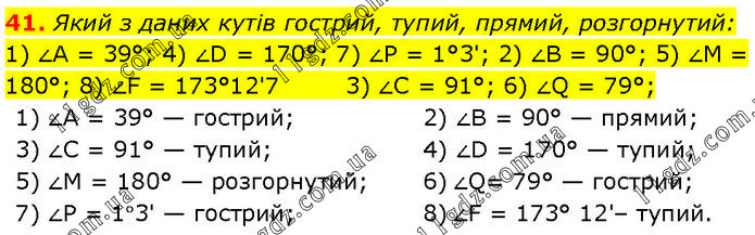 Який з даних кутів гострий, тупий, прямий, розгорнутий: 1) ∠A = 39°; 4) ∠D = 170°; 7) ∠P = 1°3'; 2) ∠B = 90°; 5) ∠M = 180°; 8) ∠F = 173°12'7 3) ∠C = 91°; 6) ∠Q = 79°; 1) ∠A = 39° — гострий; 3) ∠C = 91° — тупий; 5) ∠M = 180° — розгорнутий; 7) ∠P = 1°3' — гострий; 2) ∠B = 90° — прямий; 4) ∠D = 170° — тупий; 6) ∠Q= 79° — гострий; 8) ∠F = 173° 12'– тупий.
