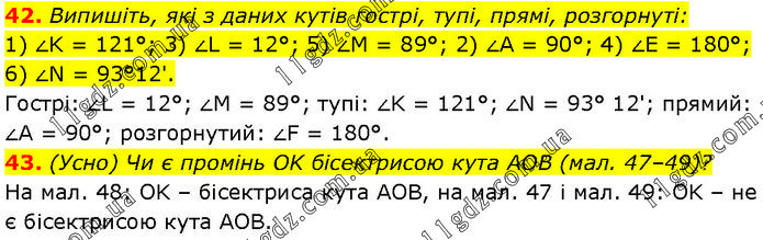 42. Випишіть, які з даних кутів гострі, тупі, прямі, розгорнуті: 1) ∠K = 121°; 3) ∠L = 12°; 5) ∠M = 89°; 2) ∠A = 90°; 4) ∠E = 180°; 6) ∠N = 93°12'. Гострі: ∠L = 12°; ∠M = 89°; тупі: ∠K = 121°; ∠N = 93° 12'; прямий: ∠A = 90°; розгорнутий: ∠F = 180°. 43. (Усно) Чи є промінь OK бісектрисою кута AOB (мал. 47–49)? На мал. 48: OK – бісектриса кута AOB, на мал. 47 і мал. 49: OK – не є бісектрисою кута AOB.