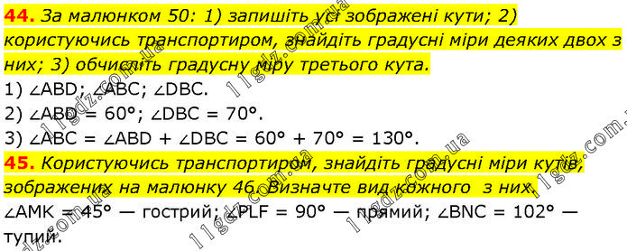 44. За малюнком 50: 1) запишіть усі зображені кути; 2) користуючись транспортиром, знайдіть градусні міри деяких двох з них; 3) обчисліть градусну міру третього кута. 1) ∠ABD; ∠ABC; ∠DBC. 2) ∠ABD = 60°; ∠DBC = 70°. 3) ∠ABC = ∠ABD + ∠DBC = 60° + 70° = 130°. 45. Користуючись транспортиром, знайдіть градусні міри кутів, зображених на малюнку 46. Визначте вид кожного з них. ∠AMK = 45° — гострий; ∠PLF = 90° — прямий; ∠BNC = 102° — тупий.