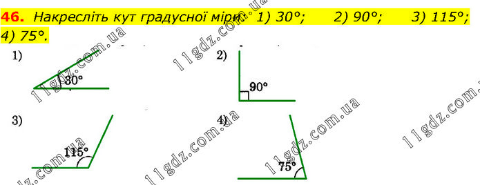 Накресліть кут градусної міри: 1) 30°; 2) 90°; 3) 115°; 4) 75°.
