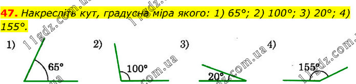 Накресліть кут, градусна міра якого: 1) 65°; 2) 100°; 3) 20°; 4) 155°.