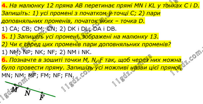 4. На малюнку 12 пряма АВ перетинає прямі MN і KL у точках С і D. Запишіть: 1) усі промені з початком у точці С; 2) пари доповняльних променів, початок яких – точка D. 1) СА; СВ; СМ; CN; 2) DK і DL; DA і DB. 5. 1) Запишіть усі промені, зображені на малюнку 13. 2) Чи є серед цих променів пари доповняльних променів? 1) NM; NP; NK; NF; 2) NM і NК. 6. Позначте в зошиті точки М, N, F так, щоб через них можна було провести пряму. Запишіть усі можливі назви цієї прямої. MN; NM; MF; FM; NF; FN.