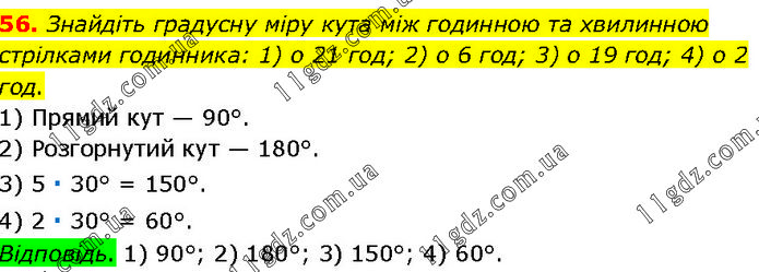 Знайдіть градусну міру кута між годинною та хвилинною стрілками годинника: 1) о 21 год; 2) о 6 год; 3) о 19 год; 4) о 2 год. 1) Прямий кут — 90°. 2) Розгорнутий кут — 180°. 3) 5 ∙ 30° = 150°. 4) 2 ∙ 30° = 60°. Відповідь. 1) 90°; 2) 180°; 3) 150°; 4) 60°.