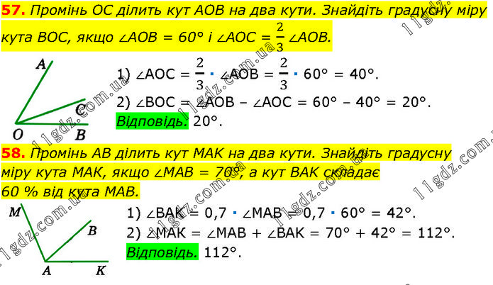 57. Промінь OC ділить кут AOB на два кути. Знайдіть градусну міру кута BOC, якщо ∠AOB = 60° і ∠AOC = 2/3 ∠AOB. 1) ∠AOC = 2/3 ∙ ∠AOB = 2/3 ∙ 60° = 40°. 2) ∠BOC = ∠AOB – ∠AOC = 60° – 40° = 20°. Відповідь. 20°. 58. Промінь AB ділить кут MAK на два кути. Знайдіть градусну міру кута МАК, якщо ∠МАВ = 70°, а кут BAK складає 60 % від кута МАВ. 1) ∠BAK = 0,7 ∙ ∠MAB = 0,7 ∙ 60° = 42°. 2) ∠МАК = ∠MAB + ∠BAK = 70° + 42° = 112°. Відповідь. 112°.