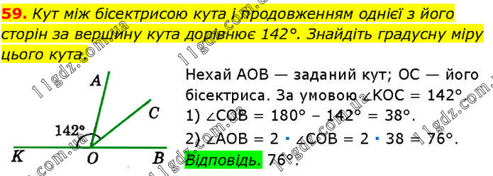 Кут між бісектрисою кута і продовженням однієї з його сторін за вершину кута дорівнює 142°. Знайдіть градусну міру цього кута. Нехай AOB — заданий кут; OC — його бісектриса. За умовою ∠KOC = 142°. 1) ∠COB = 180° – 142° = 38°. 2) ∠АОВ = 2 ∙ ∠СОВ = 2 ∙ 38 = 76°. Відповідь. 76°.