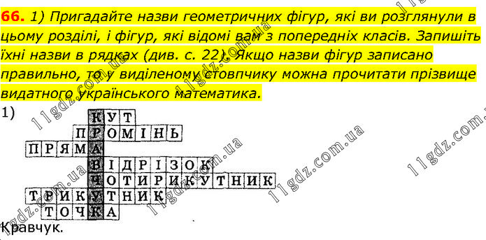 1) Пригадайте назви геометричних фігур, які ви розглянули в цьому розділі, і фігур, які відомі вам з попередніх класів. Запишіть їхні назви в рядках (див. с. 22). Якщо назви фігур записано правильно, то у виділеному стовпчику можна прочитати прізвище видатного українського математика. 1) Кравчук.
