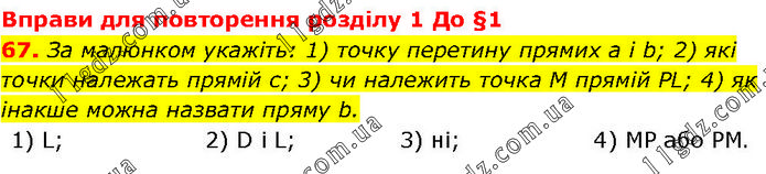 Вправи для повторення розділу 1 До §1 67. За малюнком укажіть: 1) точку перетину прямих а і b; 2) які точки належать прямій с; 3) чи належить точка M прямій PL; 4) як інакше можна назвати пряму b. 1) L; 2) D i L; 3) ні; 4) МР або РМ.