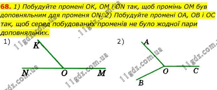 68. 1) Побудуйте промені OK, OM і ON так, щоб промінь OM був доповняльним для променя ON. 2) Побудуйте промені OA, OB і OC так, щоб серед побудованих променів не було жодної пари доповняльних.