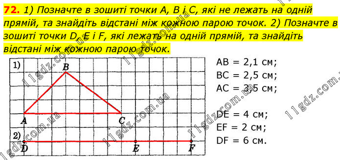 1) Позначте в зошиті точки А, В і С, які не лежать на одній прямій, та знайдіть відстані між кожною парою точок. 2) Позначте в зошиті точки D, E і F, які лежать на одній прямій, та знайдіть відстані між кожною парою точок. AB = 2,1 см; BC = 2,5 см; AC = 3,5 см; DE = 4 см; EF = 2 см; DF = 6 см.