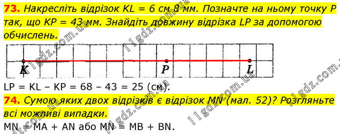 73. Накресліть відрізок KL = 6 см 8 мм. Позначте на ньому точку P так, що KP = 43 мм. Знайдіть довжину відрізка LP за допомогою обчислень. LP = KL – KP = 68 – 43 = 25 (см). 74. Сумою яких двох відрізків є відрізок MN (мал. 52)? Розгляньте всі можливі випадки. MN = MA + AN або MN = MB + BN.