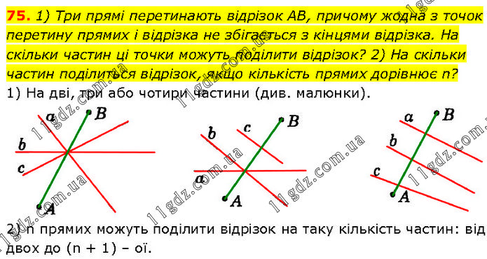 1) Три прямі перетинають відрізок AB, причому жодна з точок перетину прямих і відрізка не збігається з кінцями відрізка. На скільки частин ці точки можуть поділити відрізок? 2) На скільки частин поділиться відрізок, якщо кількість прямих дорівнює n? 1) На дві, три або чотири частини (див. малюнки). 2) n прямих можуть поділити відрізок на таку кількість частин: від двох до (n + 1) – ої.
