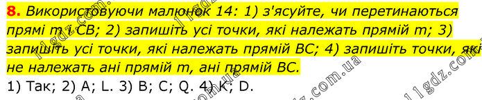 Використовуючи малюнок 14: 1) з'ясуйте, чи перетинаються прямі m і СВ; 2) запишіть усі точки, які належать прямій m; 3) запишіть усі точки, які належать прямій ВС; 4) запишіть точки, які не належать ані прямій m, ані прямій ВС. 1) Так; 2) A; L. 3) B; C; Q. 4) K; D.