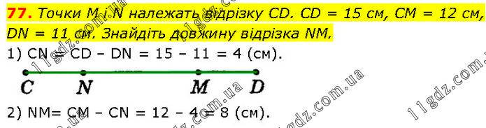 Точки M і N належать відрізку CD. CD = 15 см, CM = 12 см, DN = 11 см. Знайдіть довжину відрізка NM. 1) CN = CD – DN = 15 – 11 = 4 (см). 2) NM= CM – CN = 12 – 4 = 8 (см).