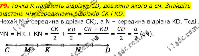 Точка K належить відрізку CD, довжина якого а см. Знайдіть відстань між серединами відрізків CK і KD. Нехай М – середина відрізка СК;, а N – середина відрізка KD. Тоді MN = MK + KN = CK/2 + KD/2 = (CK + KD)/2 = CD/2 = a/2 (см).