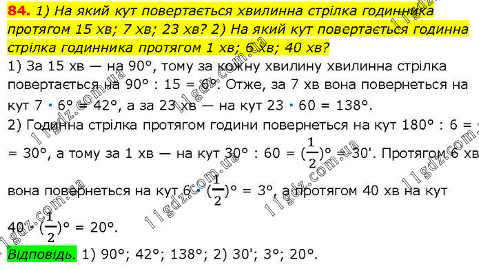 1) На який кут повертається хвилинна стрілка годинника протягом 15 хв; 7 хв; 23 хв? 2) На який кут повертається годинна стрілка годинника протягом 1 хв; 6 хв; 40 хв? 1) За 15 хв — на 90°, тому за кожну хвилину хвилинна стрілка повертається на 90° : 15 = 6°. Отже, за 7 хв вона повернеться на кут 7 ∙ 6° = 42°, а за 23 хв — на кут 23 ∙ 60 = 138°. 2) Годинна стрілка протягом години повернеться на кут 180° : 6 = = 30°, а тому за 1 хв — на кут 30° : 60 = ((1 )/2)° = 30'. Протягом 6 хв вона повернеться на кут 6 ∙ ((1 )/2)° = 3°, а протягом 40 хв на кут 40 ∙ ((1 )/2)° = 20°. Відповідь. 1) 90°; 42°; 138°; 2) 30'; 3°; 20°.