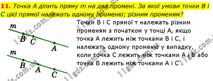 Точка А ділить пряму m на два промені. За якої умови точки B i C цієї прямої належать одному променю; різним променям? Точки B і C прямої т належать різним променям з початком у точці А, якщо точка А лежить між точками В і С, і належать одному променю у випадку, коли точка C лежить між точками A і B або точка В лежить між точками A і C .