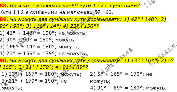 88. На яких з малюнків 57–60 кути 1 і 2 є суміжними? Кути 1 і 2 є суміжними на малюнках 57 і 60. 89. Чи можуть два суміжних кути дорівнювати: 1) 42° і 148°; 2) 90° і 90°; 3) 166° і 14°; 4) 23° і 156°? 1) 42° + 148° = 190°; не можуть; 2) 90° + 90° = 180°; можуть; 3) 166° + 14° = 180°; можуть; 4) 23° + 156° = 179°; не можуть. 90. Чи можуть два суміжних кути дорівнювати: 1) 13° і 167°; 2) 5° і 165°; 3) 11° і 179°; 4) 91° і 89°? 1) 13° + 167° = 180°; можуть; 3) 11° + 179° = 190°; не можуть; 2) 5° + 165° = 170°; не можуть; 4) 91° + 89° = 180°; можуть.