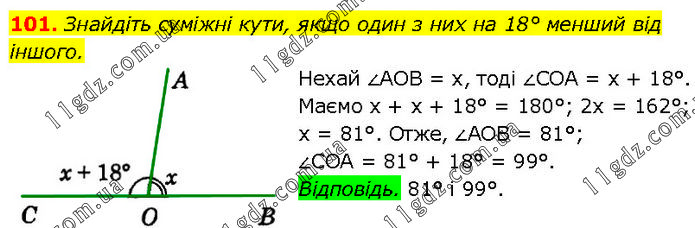 Знайдіть суміжні кути, якщо один з них на 18° менший від іншого. Нехай ∠AOB = х, тоді ∠COA = х + 18°. Маємо х + х + 18° = 180°; 2х = 162°; х = 81°. Отже, ∠AOB = 81°; ∠COA = 81° + 18° = 99°. Відповідь. 81° і 99°.