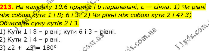На малюнку 10.6 прямі а і b паралельні, с — січна. 1) Чи рівні між собою кути 1 і 8; 6 і З? 2) Чи рівні між собою кути 2 і 4? 3) Обчисліть суму кутів 2 і 3. 1) Кути 1 і 8 – рівні; кути 6 і 3 – рівні. 2) Кути 2 і 4 – рівні. 3) ∠2 + ∠3 = 180°