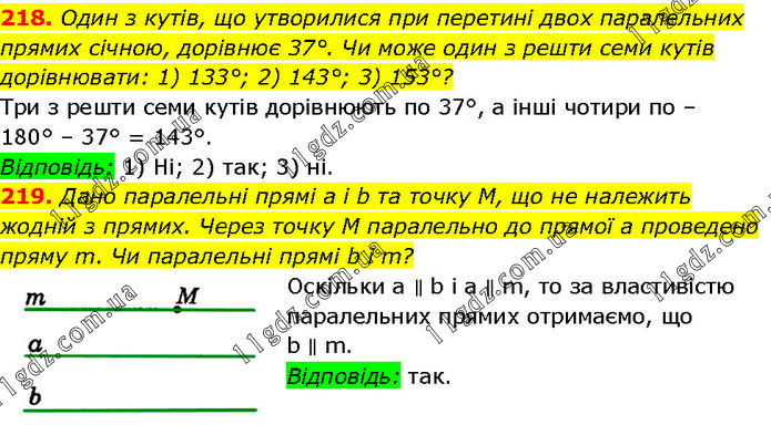 218. Один з кутів, що утворилися при перетині двох паралельних прямих січною, дорівнює 37°. Чи може один з решти семи кутів дорівнювати: 1) 133°; 2) 143°; 3) 153°? Три з решти семи кутів дорівнюють по 37°, а інші чотири по – 180° – 37° = 143°. Відповідь: 1) Ні; 2) так; 3) ні. 219. Дано паралельні прямі а і b та точку М, що не належить жодній з прямих. Через точку M паралельно до прямої а проведено пряму m. Чи паралельні прямі b і m? Оскільки a ∥ b і a ∥ m, то за властивістю паралельних прямих отримаємо, що b ∥ m. Відповідь: так.