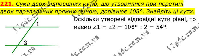 Сума двох відповідних кутів, що утворилися при перетині двох паралельних прямих січною, дорівнює 108°. Знайдіть ці кути. Оскільки утворені відповідні кути рівні, то маємо ∠1 = ∠2 = 108° : 2 = 54°.