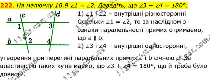 На малюнку 10.9 ∠1 = ∠2. Доведіть, що ∠3 + ∠4 = 180°. 1) ∠1 і ∠2 – внутрішні різносторонні. Оскільки ∠1 = ∠2, то за наслідком з ознаки паралельності прямих отримаємо, що а ∥ b. 2) ∠3 і ∠4 – внутрішні односторонні, утворення при перетині паралельних прямих а і b січною d. За властивістю таких кутів маємо, що ∠3 + ∠4 = 180°, що й треба було довести.