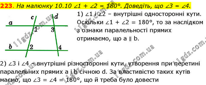 На малюнку 10.10 ∠1 + ∠2 = 180°. Доведіть, що ∠3 = ∠4. 1) ∠1 і ∠2 – внутрішні односторонні кути. Оскільки ∠1 + ∠2 = 180°, то за наслідком з ознаки паралельності прямих отримаємо, що а ∥ b. 2) ∠3 і ∠4 – внутрішні різносторонні кути, утворення при перетині паралельних прямих а і b січною d. За властивістю таких кутів маємо, що ∠3 = ∠4 = 180°, що й треба було довести